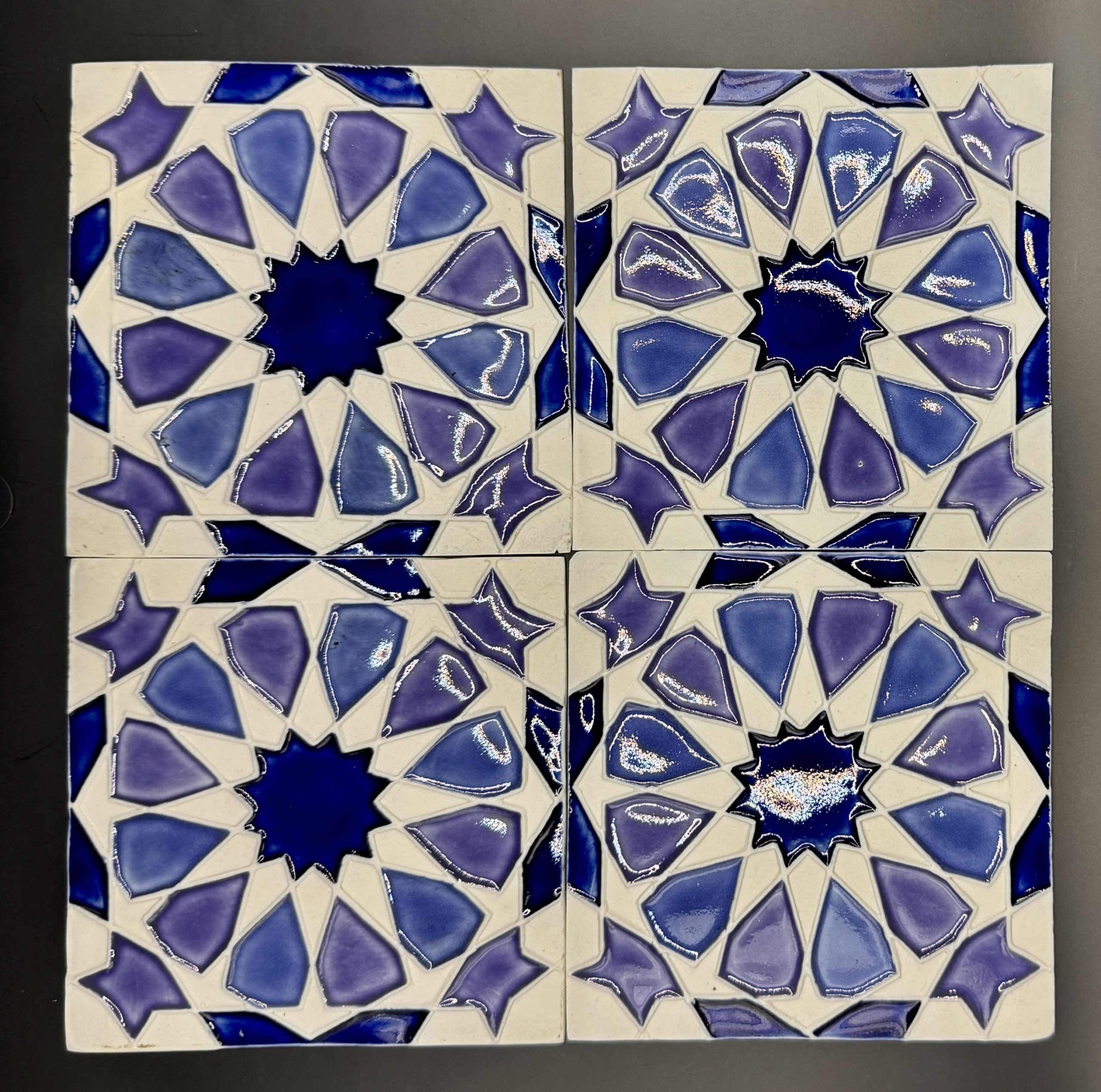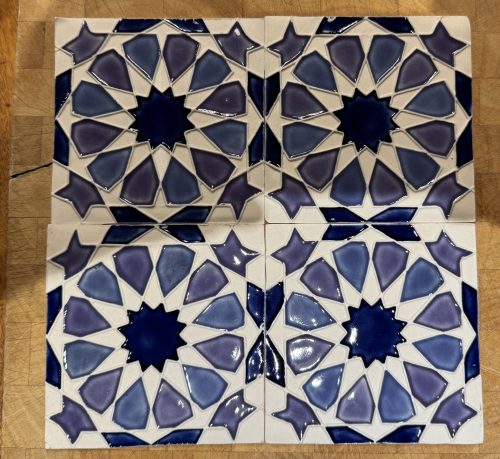 This porcelain tile based on a design from a mosque in Damascus geometry has been made from a plaster mould, hand carved by Fiona Wilcock. It has been fired and glazed and set in a box frame to highlight the colour and texture.
